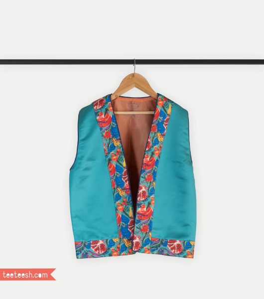 جلیقه ساتن یلدایی سبزآبی با نوار سبزآبی طرح انار