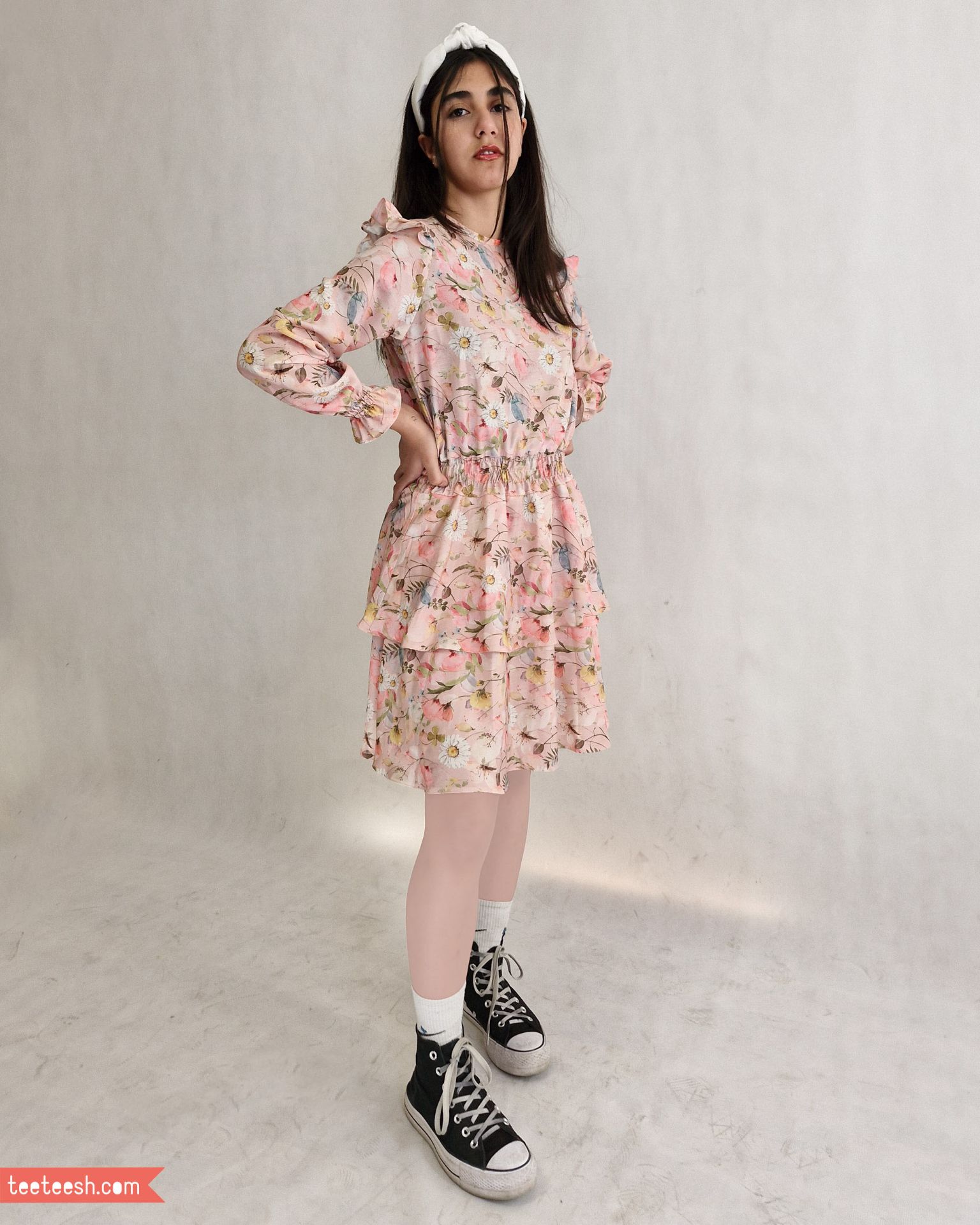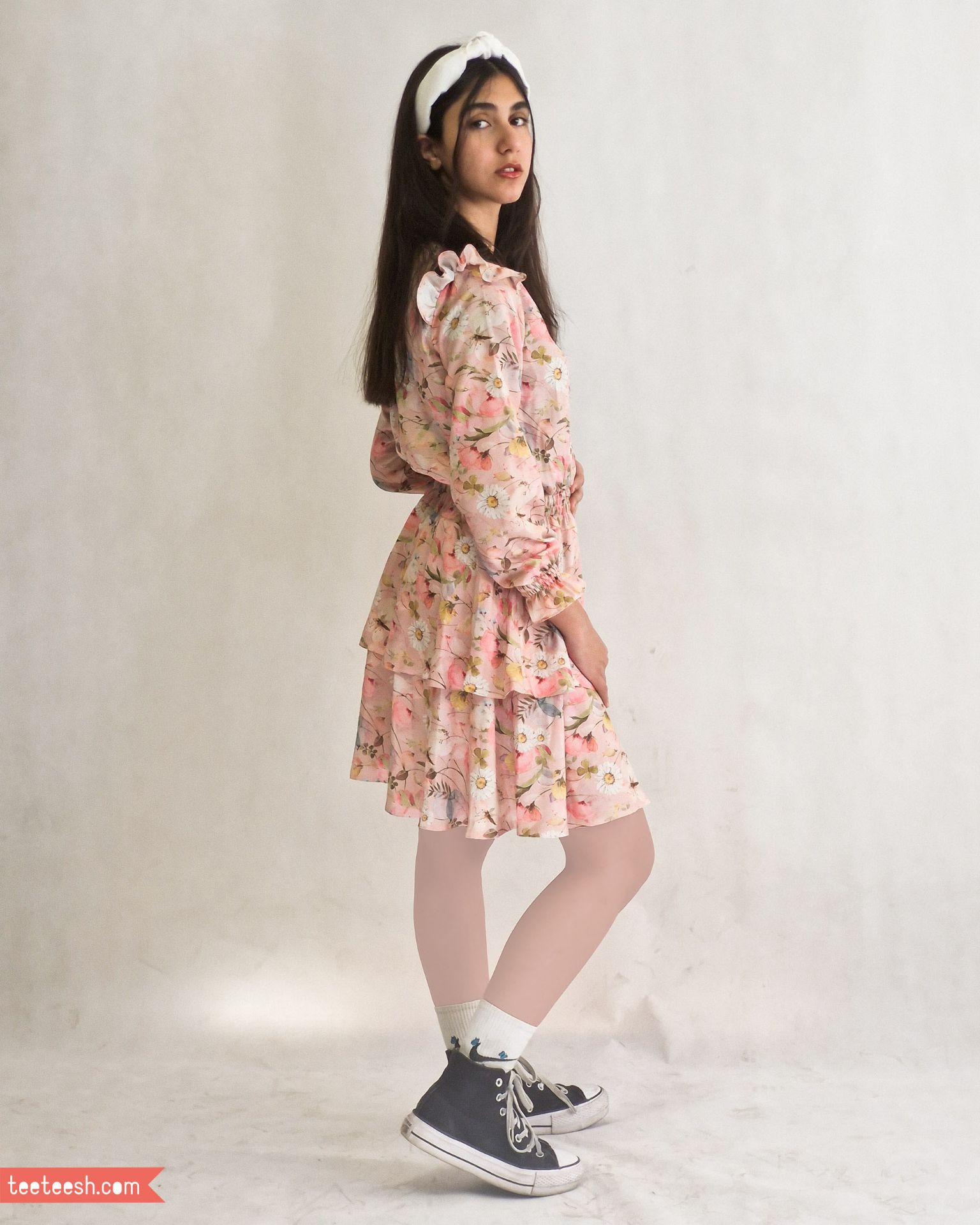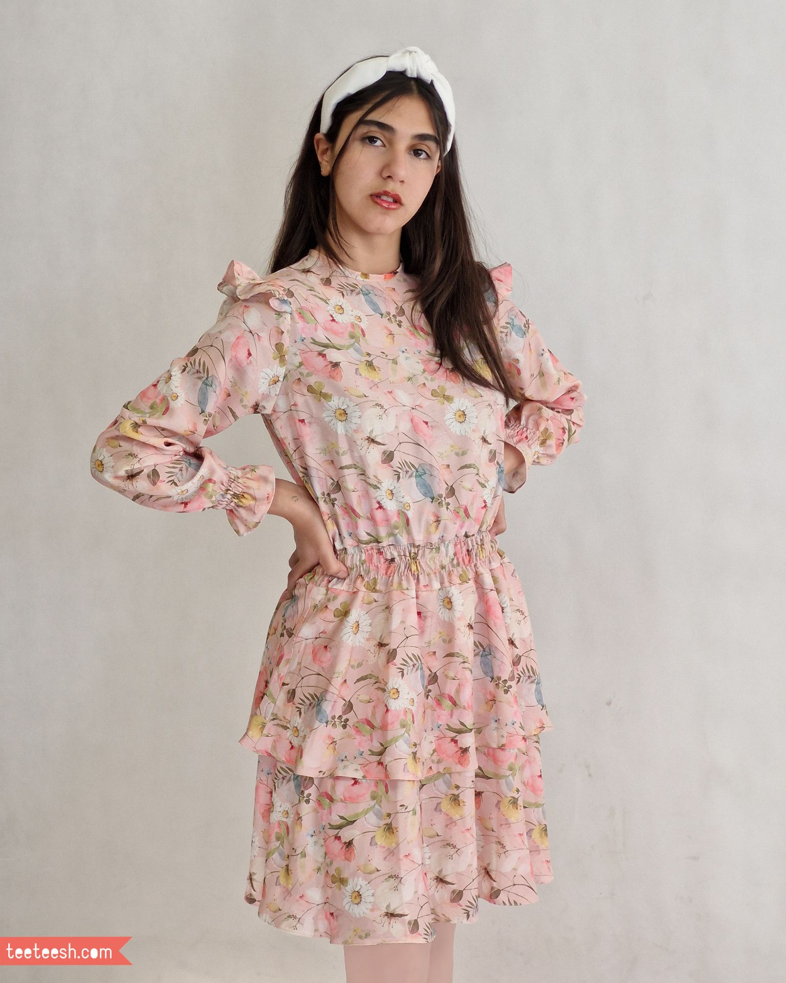 پیراهن کمرکش صورتی گلدار